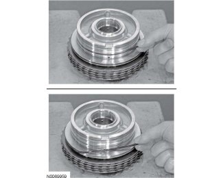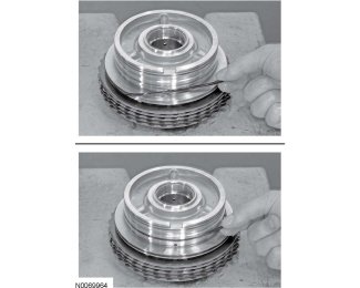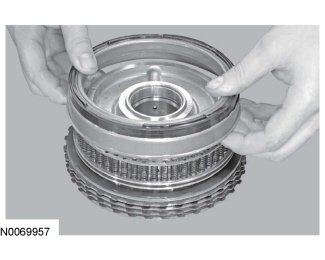 Install the Overdrive Clutch, Balance Piston and Direct Clutch Compressor 307-589/2 and the Forward/Intermediate Spring Compressor 307-584/2 on the direct clutch cylinder. Using a press, compress the direct clutch piston return spring and install the snap ring.