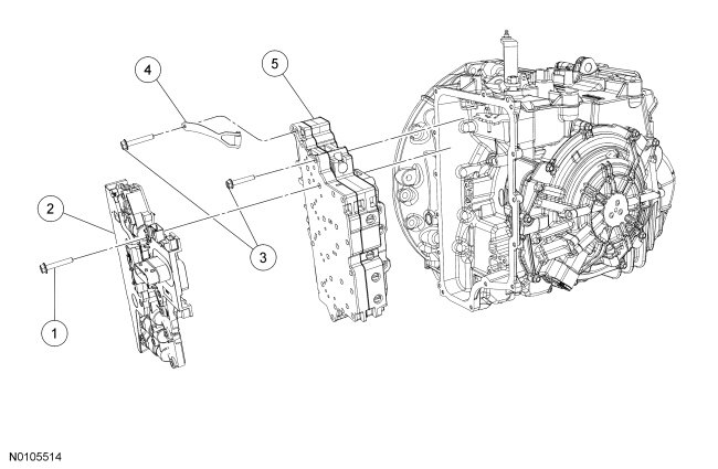 5. NOTICE: Make sure not to pinch the Turbine Shaft Speed (TSS), Output Shaft Speed (OSS) or Transmission Range (TR) sensor wiring harnesses when installing the solenoid body. Damage to the wiring harness will occur.