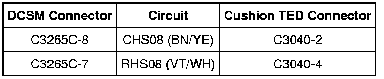 - Measure the resistance between DCSM C3265C, harness side and cushion TED C3040, harness side using the following chart.