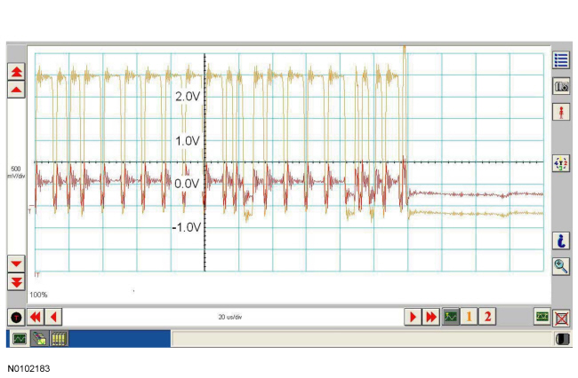 NOTE: The oscilloscope traces below are from the Integrated Diagnostic System (IDS) oscilloscope taken using the IDS pre-configured CAN settings. The traces are for both data (+) and data (-) taken simultaneously (2-channel) at a sample rate of 1 mega-sample per second (1MS/s) or greater.