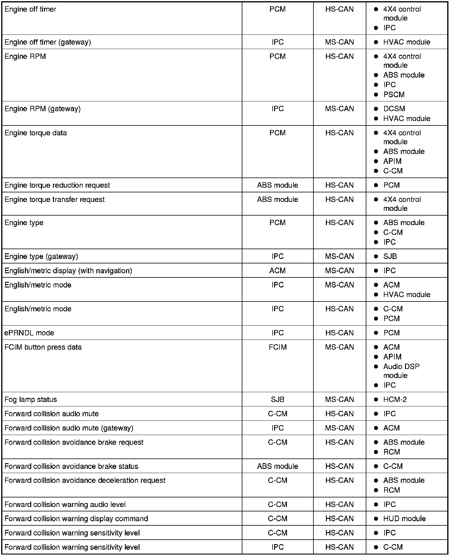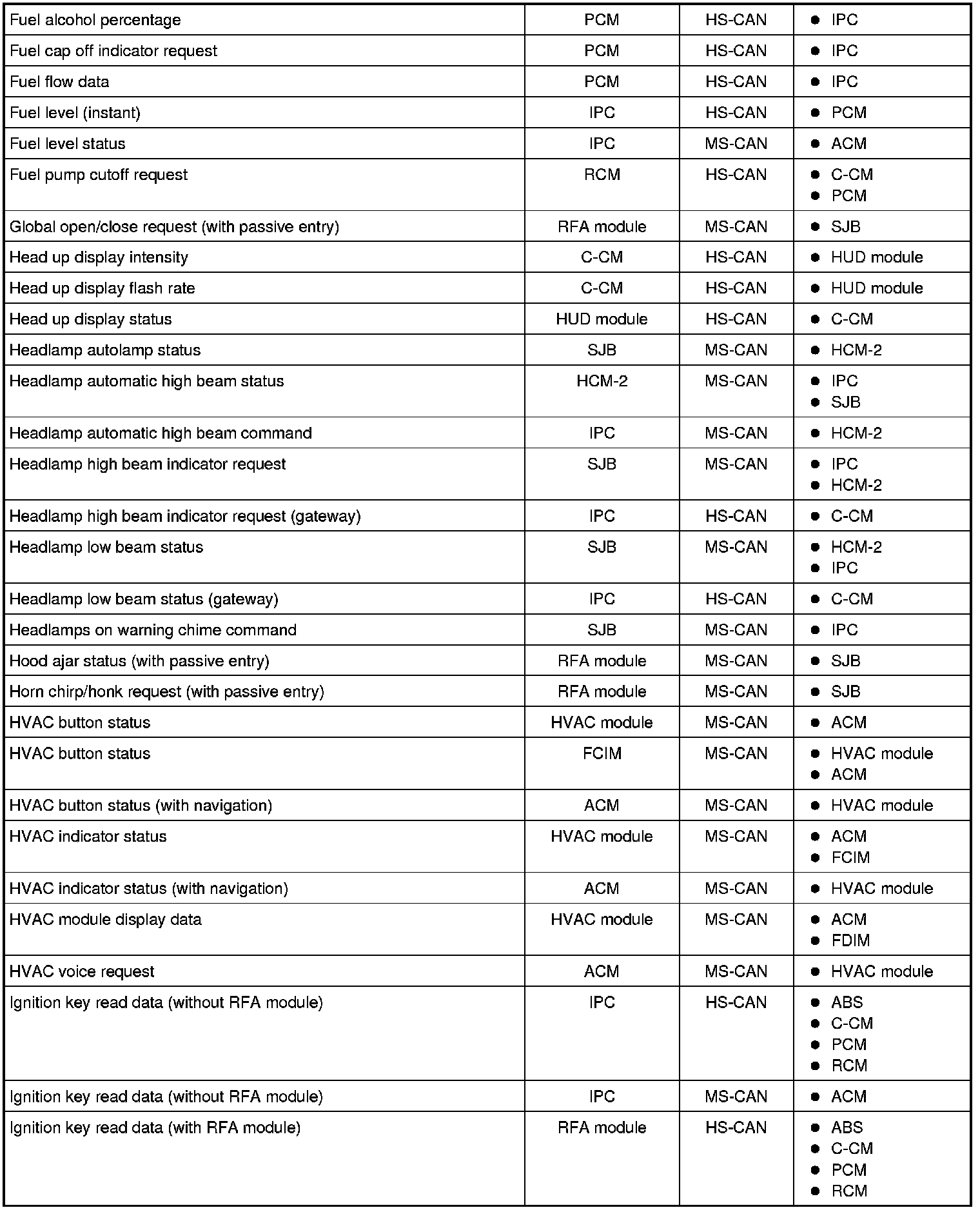 NOTE: This chart describes the specific HS-CAN and MS-CAN messages broadcast by each module, and the module(s) that receive the message.
