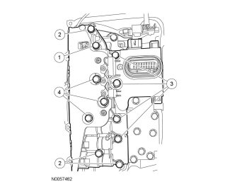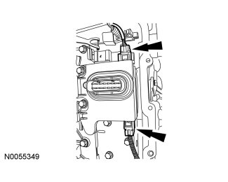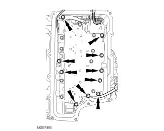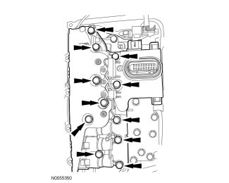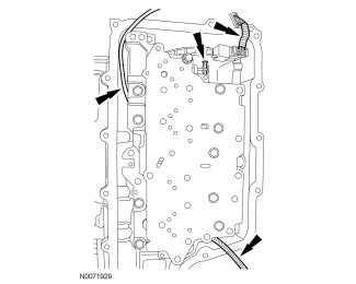 7. NOTICE: Make sure not to pinch the Turbine Shaft Speed (TSS), Output Shaft Speed (OSS) or Transmission Range (TR) sensor wiring harnesses when installing the solenoid body. Damage to the wiring harness will occur.