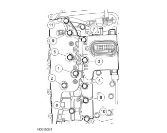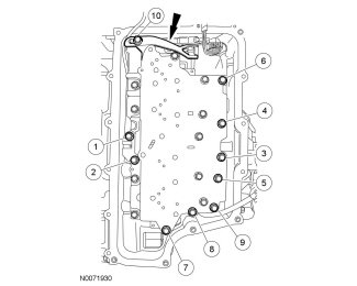 5. Install the TR sensor detent spring and the 10 bolts. Tighten the valve body bolts in the sequence shown.