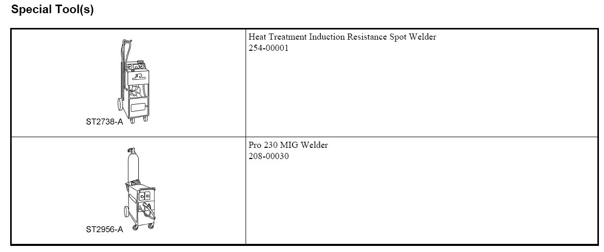 1. NOTE: Factory spot welds may be substituted with either resistance spot welds or MIG plug welds. Spot/plug welds should equal factory welds in both location and quantity. Do not place a new spot weld directly over an original weld location. Plug weld hole should equal 8 mm (0.31 in) diameter.