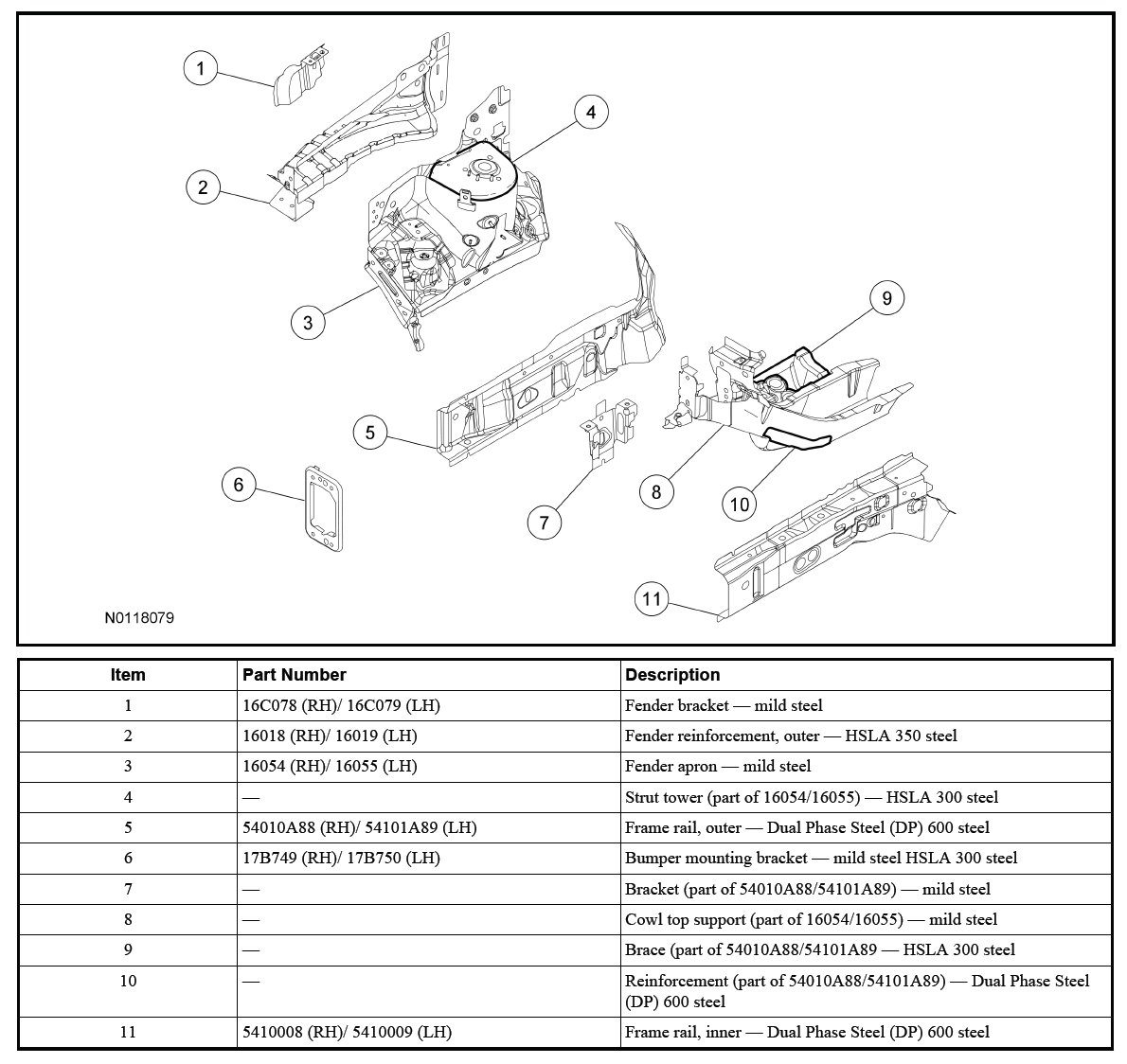 Ford Motor Company does not endorse, cannot attest to, and makes no representations regarding structural repairs (frames, rails, aprons and body panels) carried out using non-genuine Ford Motor Company parts or non-Ford-approved methods. In particular, Ford makes no representations that the vehicle will meet any crash safety or anti-corrosion performance requirement. Such parts and methods have not been tested by Ford, and may not meet Ford's requirements for safety, performance, strength, quality, durability and corrosion protection. Ford Motor Company bears no responsibility or liability of any kind if repairs are performed using alternative structural component repair procedures and/or parts.