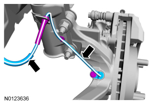 7. NOTICE: The white stripe on the wheel speed sensor harness is used for orientation purposes. Correct routing of the wheel speed sensor and harness is essential to prevent contact damage to the harness.
