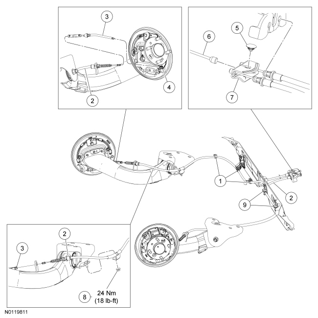 NOTICE: Use care when releasing the RH rear parking brake cable from the plastic brackets or damage to the brackets may occur.