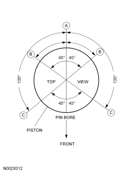 5. Make sure the ring gaps (oil spacer- A, oil ring- B, compression ring- C) are correctly spaced around the circumference of the piston.