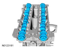 NOTE: Apply clean engine oil to the bearing surfaces of the camshaft bearing caps and the VCT (Variable Camshaft Timing) bridge.