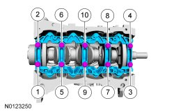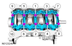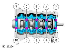 3. Tighten the 10 original main bearing beam bolts in the sequence shown in 2 stages.
