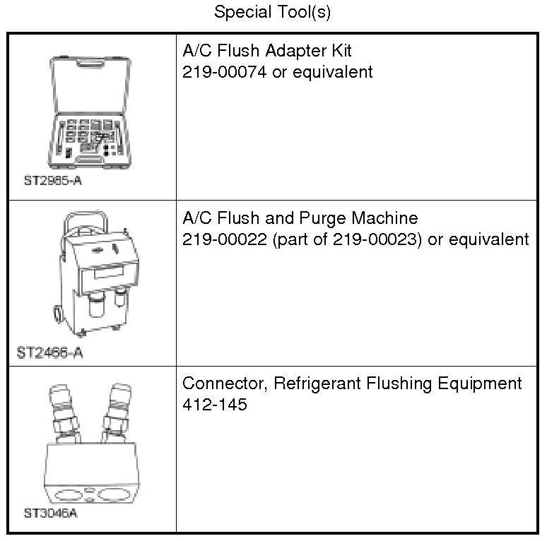 NOTE: Ford Motor Company has approved a procedure to provide technicians with a non-Chlorofluorocarbons (CFC) method of flushing contaminated A/C system heat exchangers. The procedure allows the specific components to be cleaned and flushed while installed in their normal in-vehicle location. The types of contamination flushed include particle matter that results from A/C compressor or desiccant failure and gummy residue that can form when refrigerant oil is overheated during A/C compressor seizure. The flushing process is a 2-step procedure that involves the use of an A/C Flush and Purge Machine to: