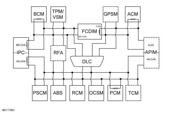 The Infotainment Controller Area Network (I-CAN) is connected to the DLC (Data Link Connector), but the I-CAN (Infotainment Controller Area Network) modules communicate with the scan tool over the MS-CAN (Medium Speed Controller Area Network). The Front Control/Display Interface Module (FCDIM) is used as a gateway module for the messages to transfer between the scan tool and the modules on the I-CAN (Infotainment Controller Area Network).