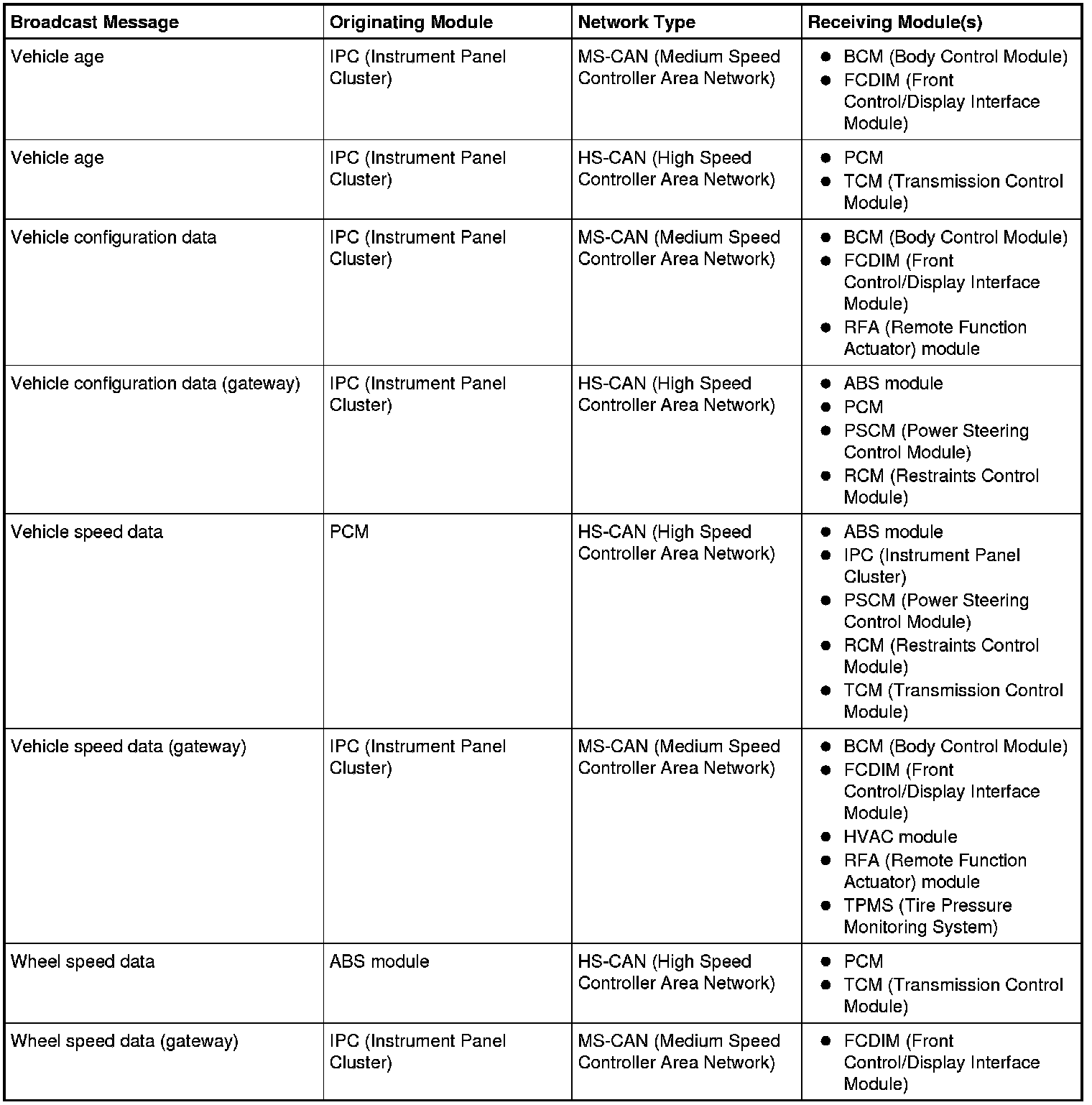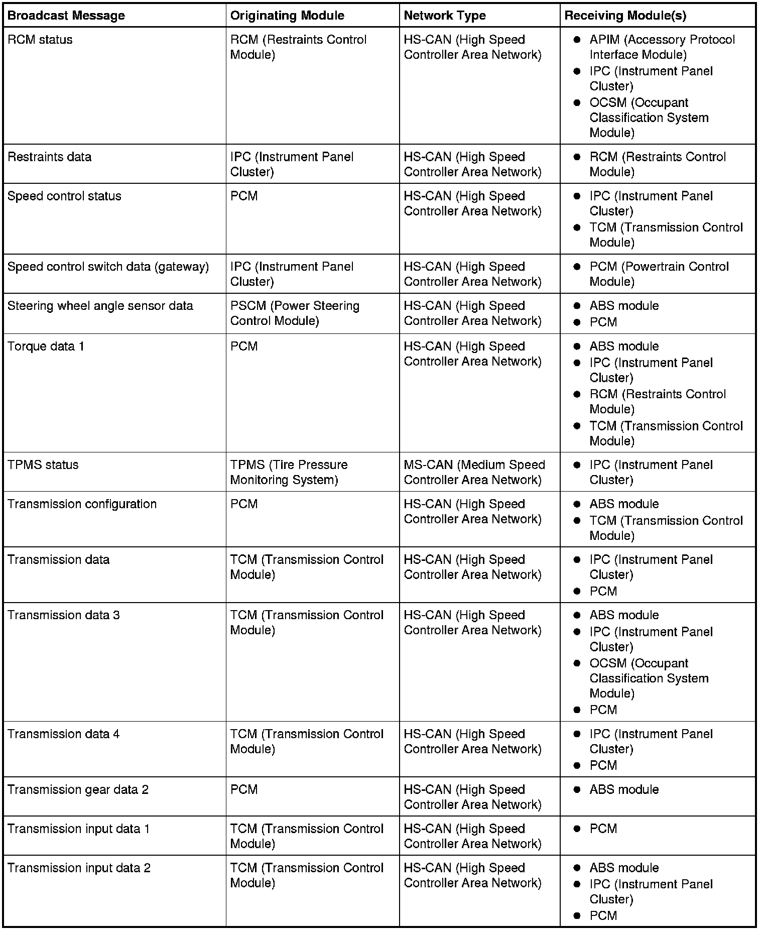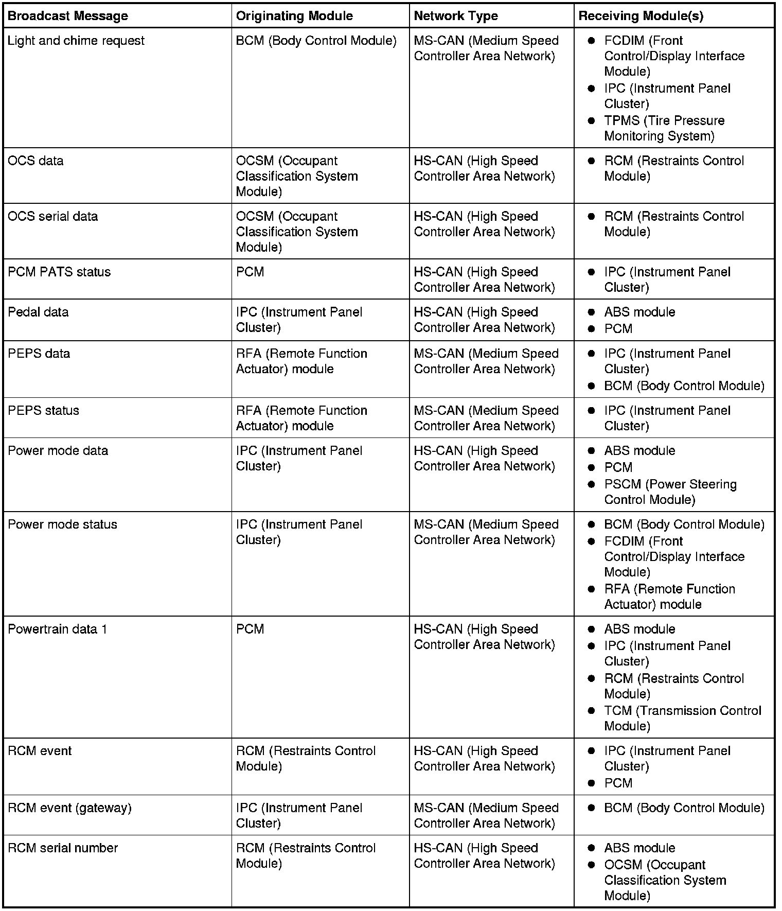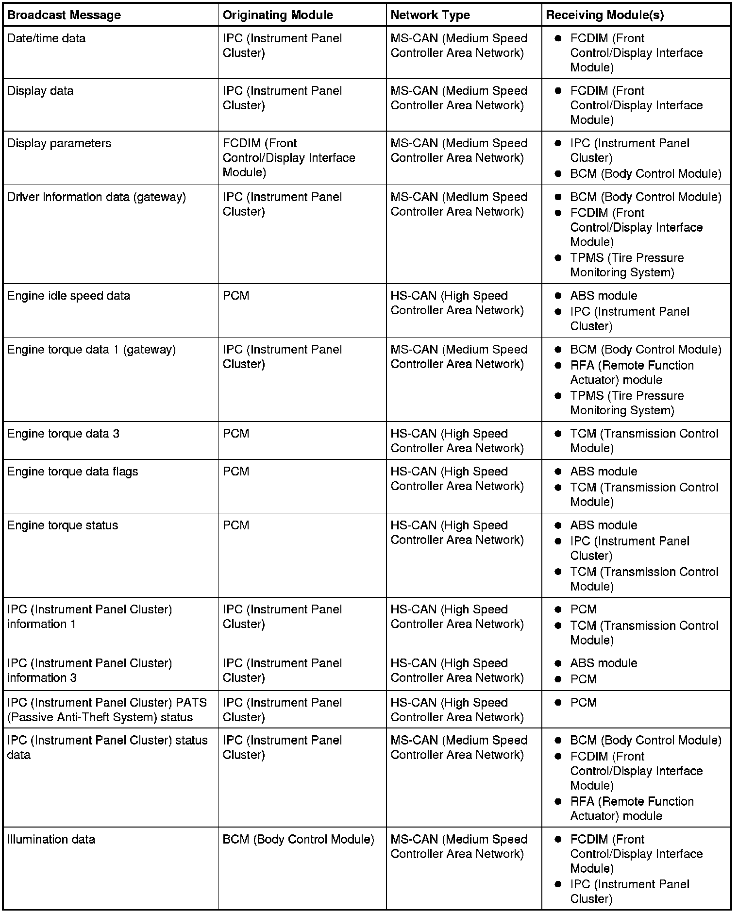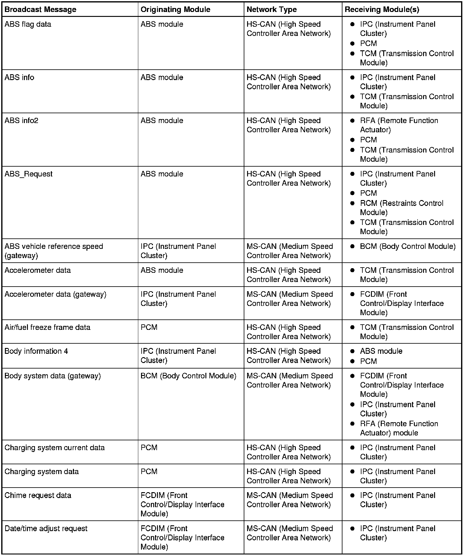 NOTE: This chart describes the specific HS-CAN (High Speed Controller Area Network) and MS-CAN (Medium Speed Controller Area Network) messages broadcast by each module, and the module(s) that receive the message.