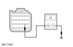 - Measure the resistance between the RCM (Restraints Control Module) C310A-14, circuit GD174 (BK/WH), harness side and ground.