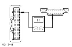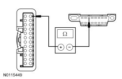 - Measure the resistance between the BCM (Body Control Module) C2280B-7, circuit GD115 (BK/GY), harness side and ground; and C2280B-16, circuit GD115 (BK/GY), harness side and ground.