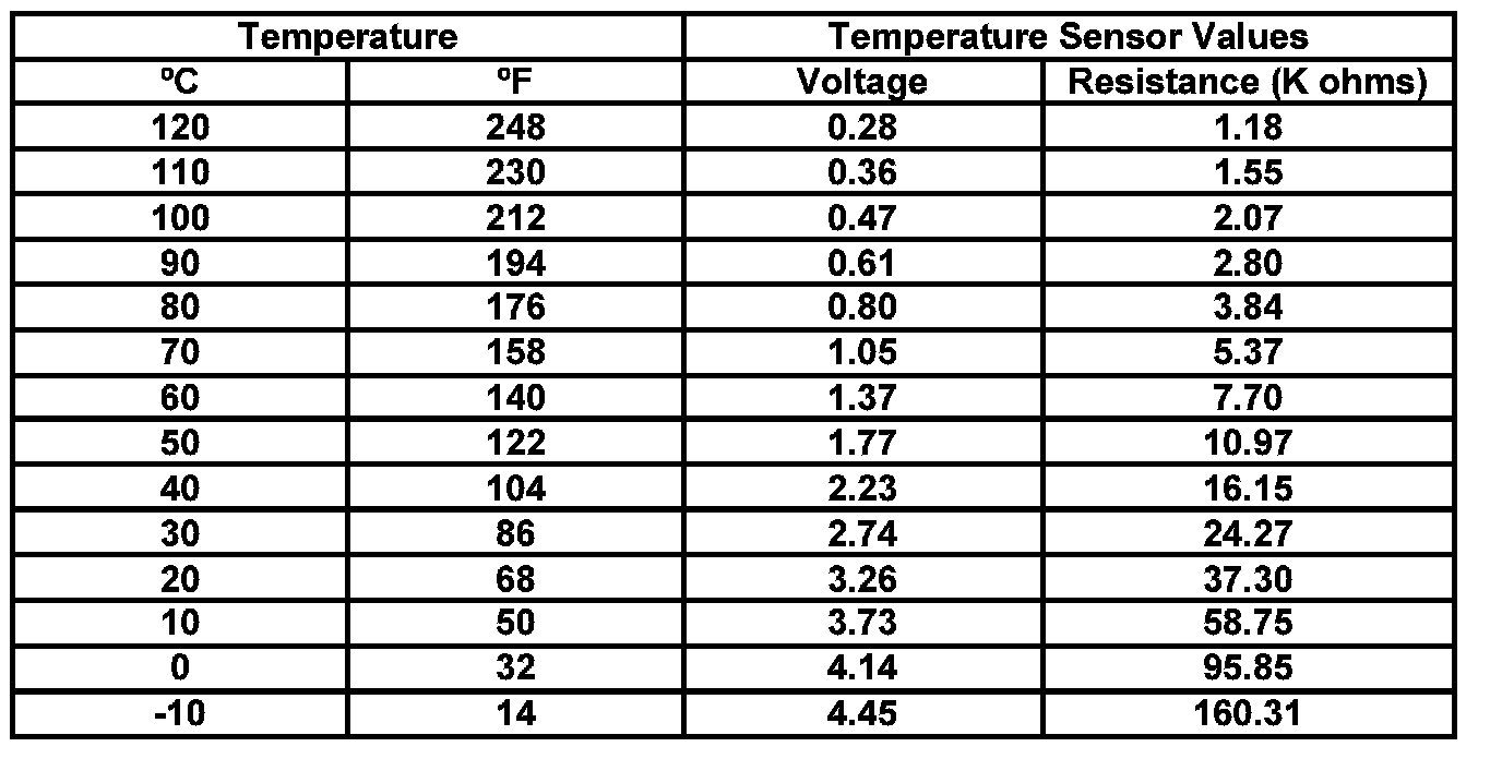 TEMPERATURE SENSOR VOLTAGE AND RESISTANCE SPECIFICATIONS