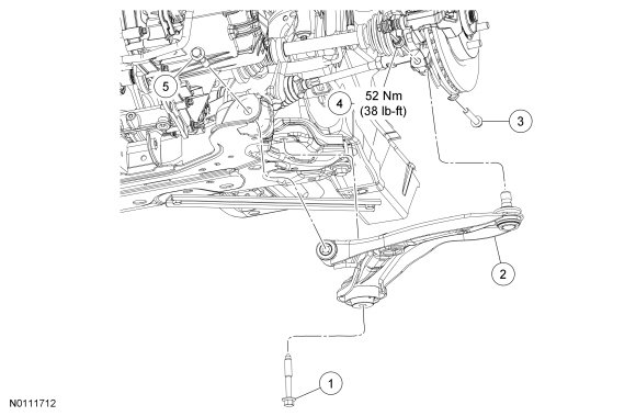NOTICE: Tighten suspension bushing fasteners with the weight of the vehicle resting on the wheel and tires or incorrect clamp load and bushing damage may occur.