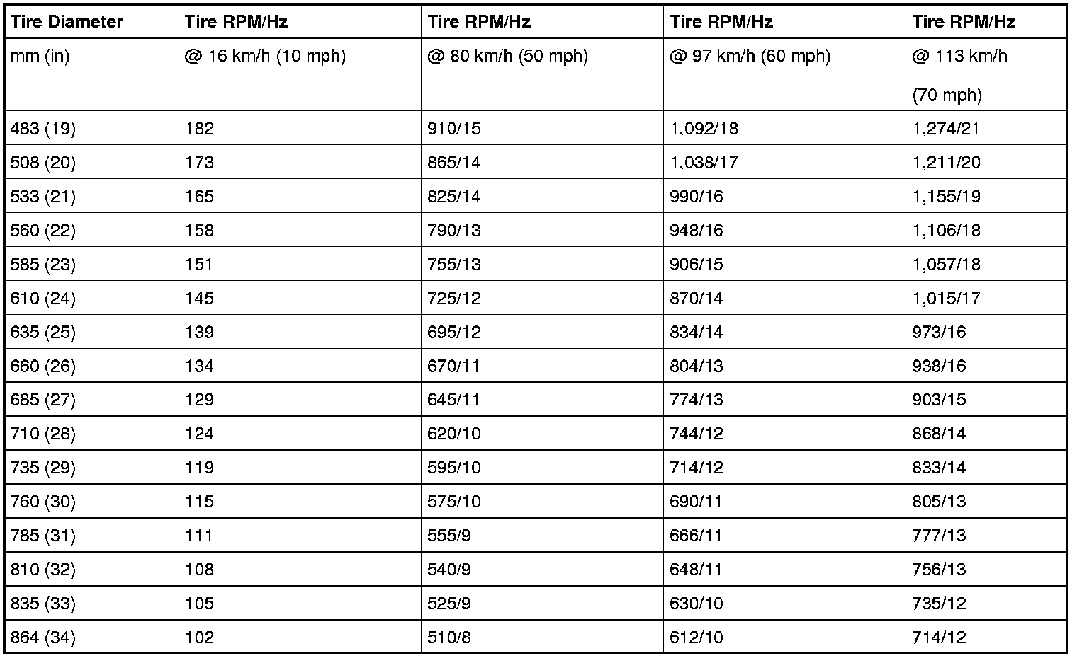 - Obtain the corresponding tire and wheel rpm and frequency from the Tire Speed and Frequency Chart.