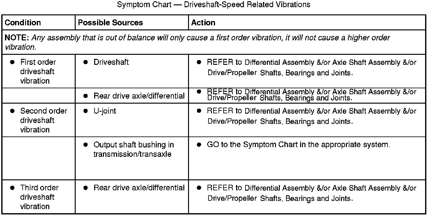 Use the diagnostic instructions along with the necessary listed tools to identify the vibration order and to isolate the symptom and the possible systems associated with that symptom. Then based on the results from the road test, make a determination of which action in the symptom chart to take first. Since it is possible any one of multiple systems may be the cause of the symptom, it may be necessary to use a process of elimination type diagnostic approach to pinpoint the concern. Refer to the system(s) indicated to identify and isolate the cause or rule that system out as being the causal system for the symptom.