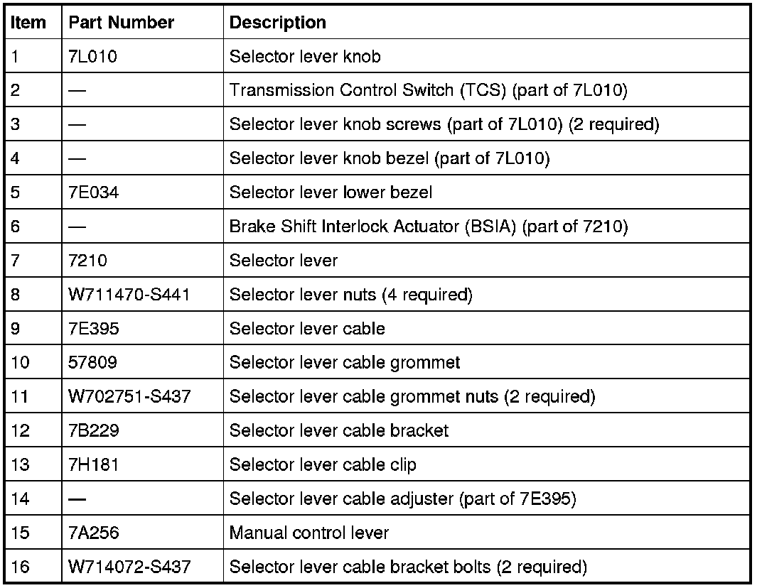 The selector lever controls the transaxle gear selection through the selector lever cable. When the selector lever is moved to the desired mode of operation it moves the selector lever cable which moves the manual control lever on the transaxle. This results in the desired gear selection. The selector lever knob controls the cable detent and selector lever locking position.