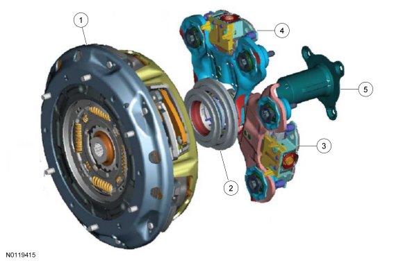 The clutch and actuator sub - system consists of engine crankshaft mounted rotating components. These include, a center flywheel, odd and even clutch pressure plates, clutch actuating mechanisms and engagement components. The clutch actuators are independent systems within the clutch housing that apply an axial force to the clutch diaphragm springs causing their respective clutch to apply. This apply force is reacted back into the transaxle through the input shaft unlike a manual transaxle dry clutch system, no thrust is applied to the engine crankshaft. Normally the clutch capacity commands are mutually exclusive (to prevent tie-up) with minor overlaps to allow synchronous shifting. A clutch "touch point" position must be established by a learning algorithm within the system software. Establishing the touch point is the system's method for ensuring that the displacement-based clutch actuation system is properly calibrated. This is necessary so that the clutch capacity can be controlled correctly by the TCM (Transmission Control Module) and be engaged and released to the required torque capacity and within the required time.