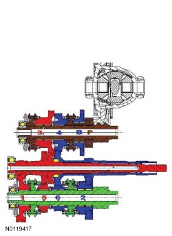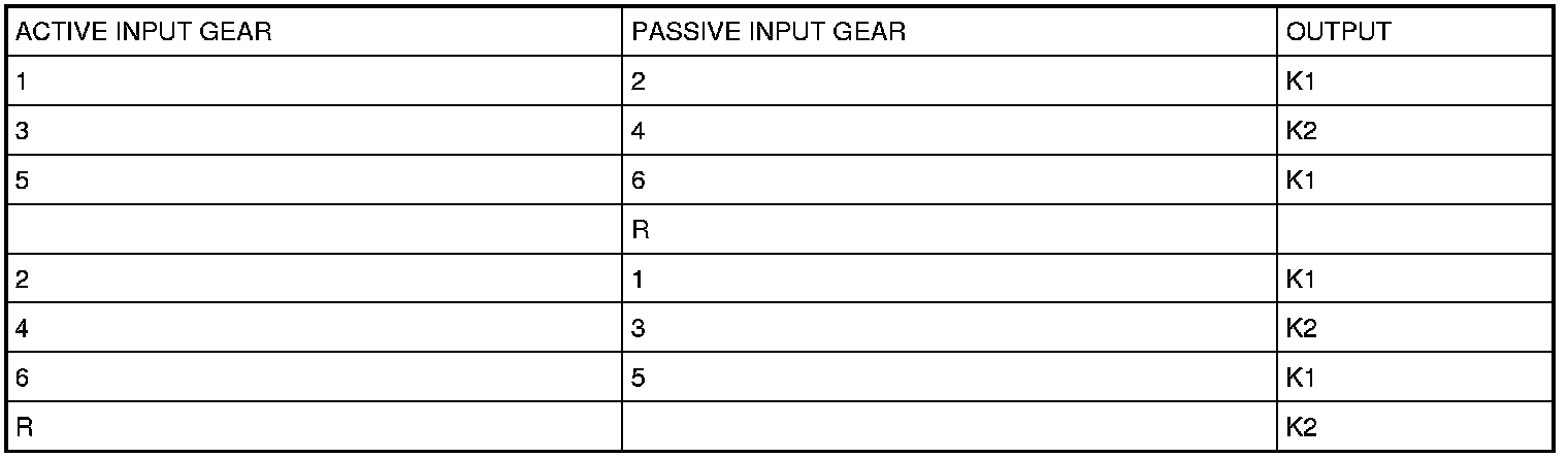 The passive input system can be viewed as two transaxles within a common housing (one for 1st, 3rd & 5th and another for Reverse, 2nd, 4th & 6th). For any driving gear there is one transaxle actively engaged in the power flow between the engine and the wheels and one that is disconnected or passive. The non-driving, or passive input shaft system consists of the input shaft and clutch disc, support bearings and the meshed speed gears with their needle roller bearings.