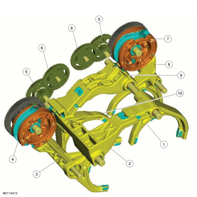The shift system consists of two independent sub-systems for controlling the transaxle synchronizer pre - selections and engagements. Using this arrangement provides an independent control of the two transaxles and a mechanical interlock that prevents two gears within the same transaxle from being engaged simultaneously. The TCM (Transmission Control Module) houses two electric motors that mesh with and drive the first double gear wheel, which drives the second double gear which finally drives the shift drum. Gearing between the shift motors and the drums reduce speed and multiply torque. Position sensors in the TCM (Transmission Control Module) detect feedback of the motor angular position. Shift drum position is learned by the TCM (Transmission Control Module) during a teach-in process that involves rotating each drum against hard stops located on the shift drum and the transaxle housing.