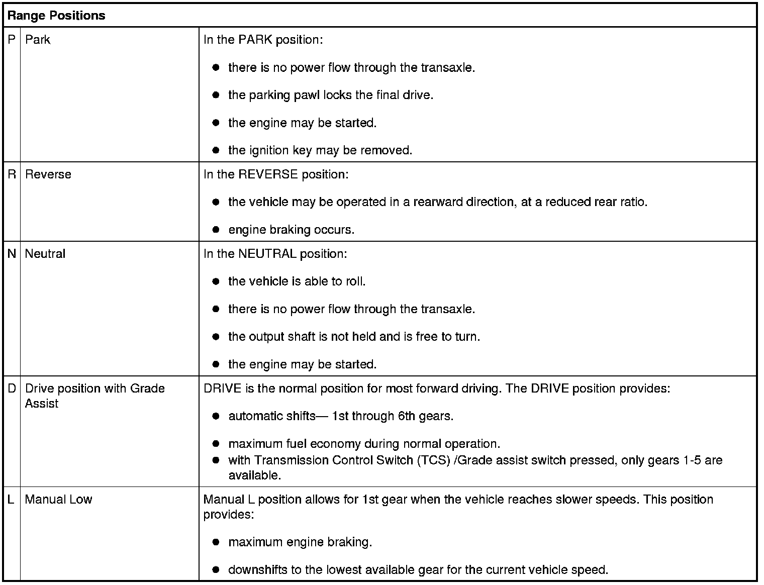 The transaxle range selector has 5 positions: P, R, N, D, L.