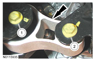 19. Install the transaxle roll restrictor and the 2 roll restrictor bolts. Tighten the bolts in the sequence shown.