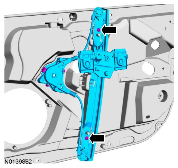 - Reaching between the door frame and carrier, remove the 2 window regulator bolts.
