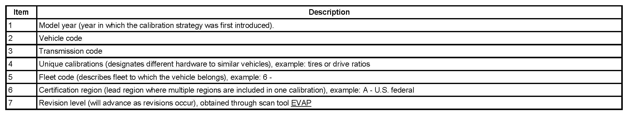 The Emission/Corporate Average Fuel Economy/CO2 Compliance Department is responsible for assigning these calibration numbers. Unique identifications are assigned to cover similar vehicles to differentiate between tires, drive configurations, final drive ratios and other calibration-significant factors. These 2 characters are chosen by the analyst to provide identifiable information unique to each calibration. For example, using the number 2 to denote a 2- valve engine versus using the number 4 to denote a 4-valve engine provides an easily identifiable difference.