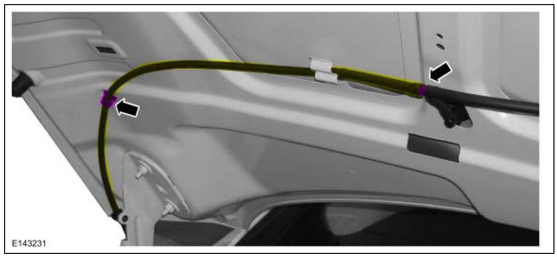 3. Disconnect the washer hose and pin-type retainers and position aside the washer hose.