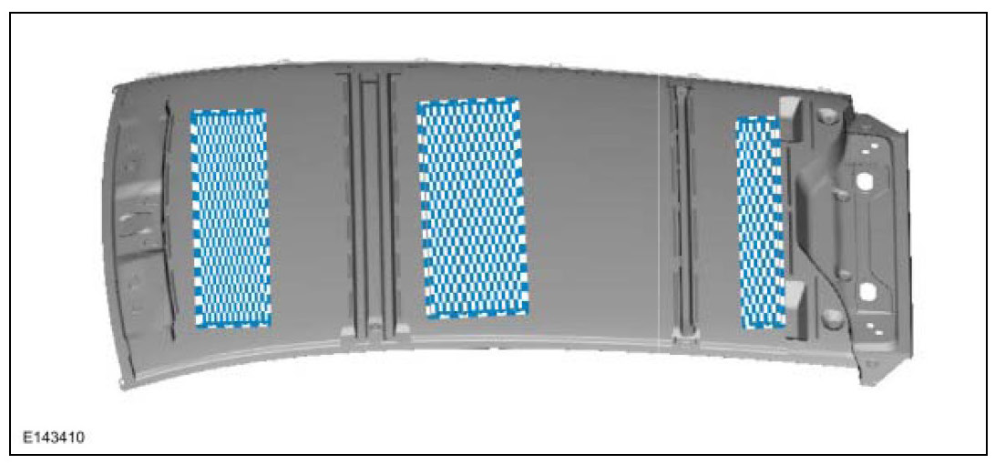 NOTE: Roof panel without sunroof shown. Roof panels with sunroof do not use the forward Noise, Vibration, or Harshness (NVH) pad.