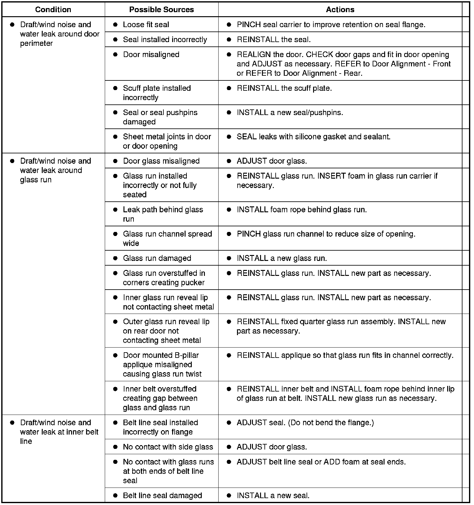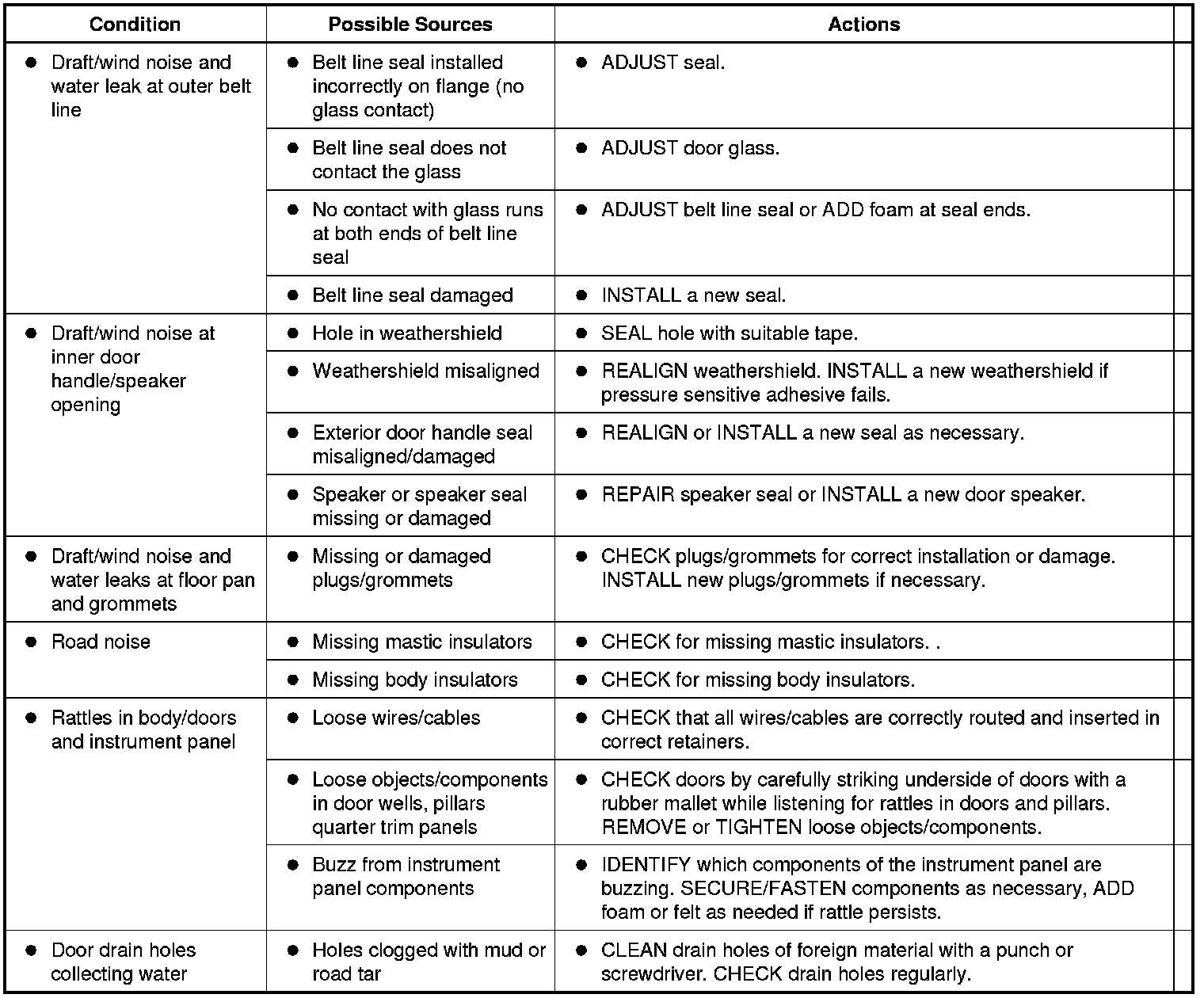 Most dust and water leaks occur due to missing or incorrectly installed body sealer or components. The source of the leak is detected by: