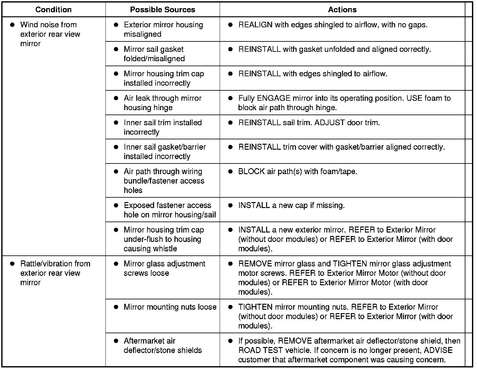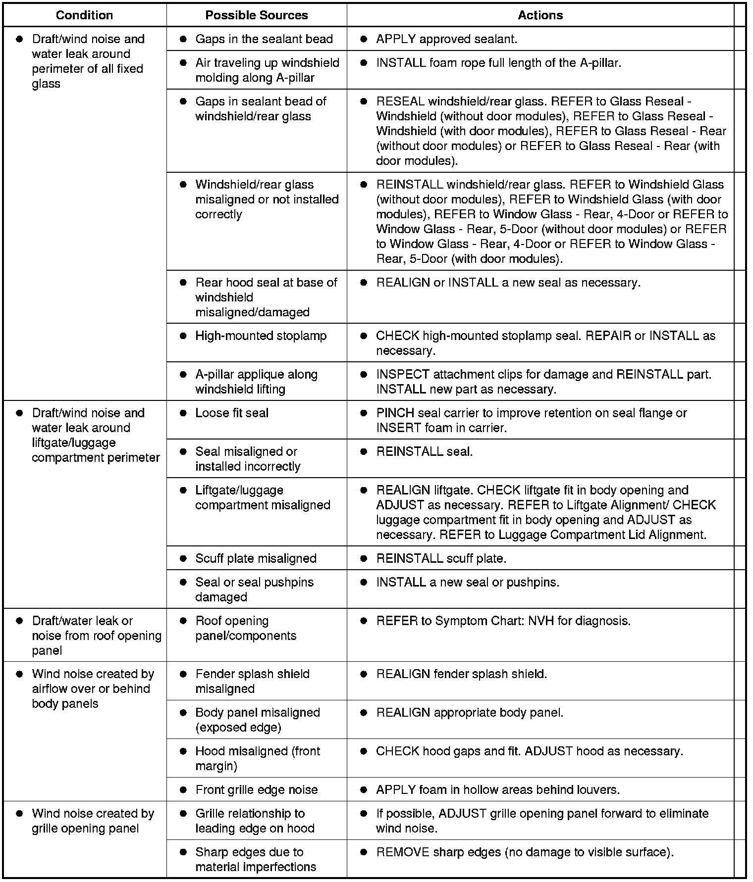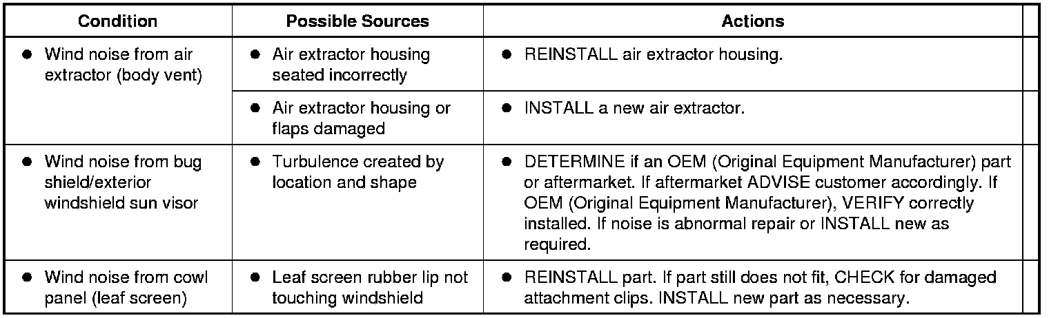 Most wind noise leaks occur at the corners of the windows or in the doors. Wind noise is detected by driving the vehicle at highway speeds or at speeds as specified by the customer. The vehicle should be driven in 4 different directions, with all the windows closed, the radio off and the A/C blower motor off.