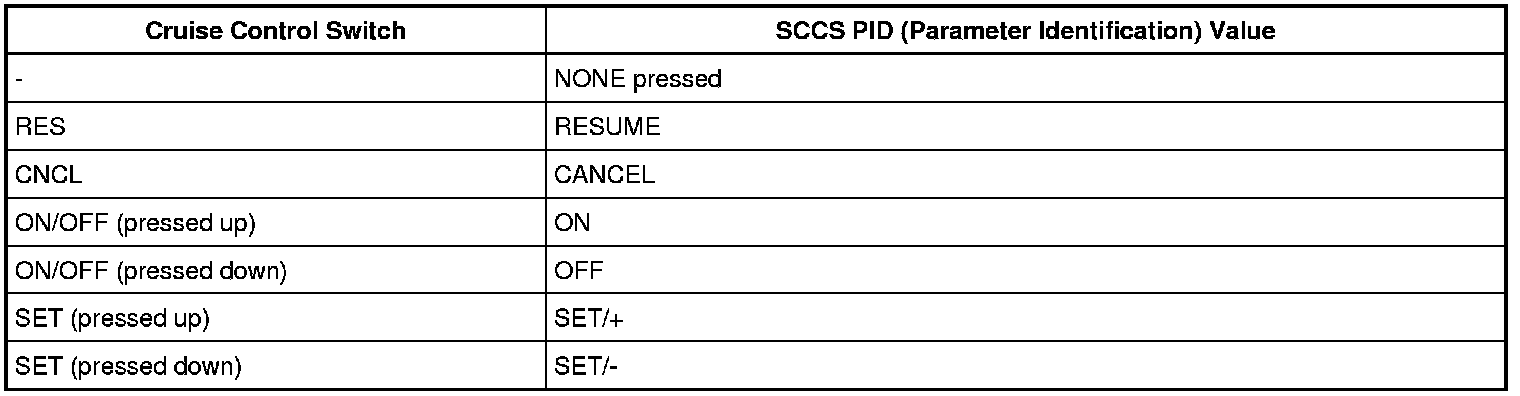 3. Using the table, press each cruise control switch while monitoring the cruise control switch PID (Parameter Identification) SCCS