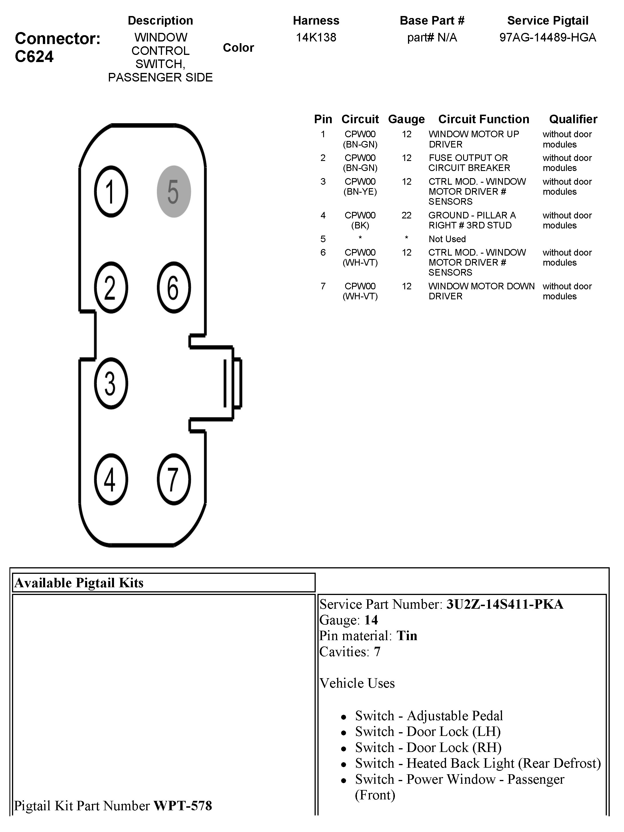 C624 Window Control Switch, Passenger Side