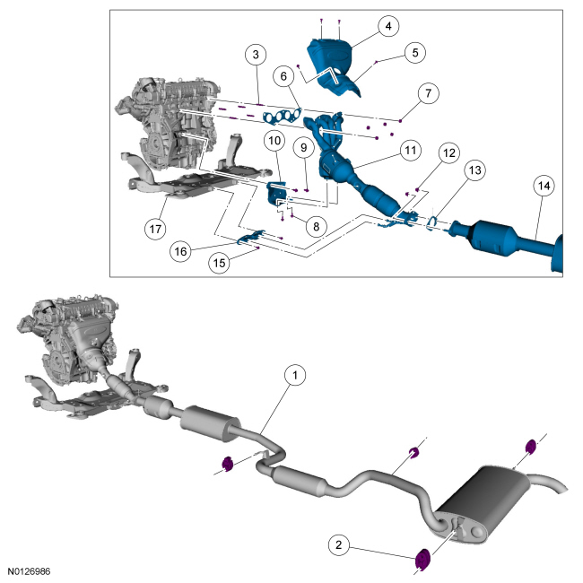 NOTE: PZEV (Partial Zero Emissions Vehicle) exhaust components shown, non PZEV (Partial Zero Emissions Vehicle) exhaust components similar.