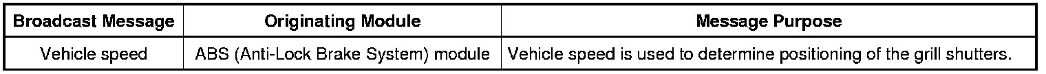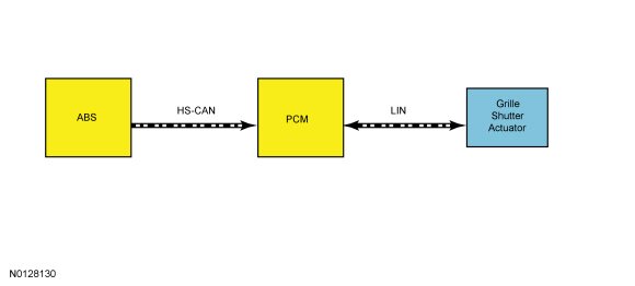 The PCM (Powertrain Control Module) communicates the desired position (open or closed) of the grille shutter based on various PCM (Powertrain Control Module) inputs (vehicle speed, coolant temperature, ambient temperature, A/C (Air Conditioning) system pressure, etc.). The PCM (Powertrain Control Module) communicates to the grille shutter actuator via a LIN (Local Interconnect Network). The LIN (Local Interconnect Network) supports bi-directional communication between the grille shutter actuator and PCM (Powertrain Control Module), allowing the grille shutter actuator to communicate position and fault information to the PCM (Powertrain Control Module).