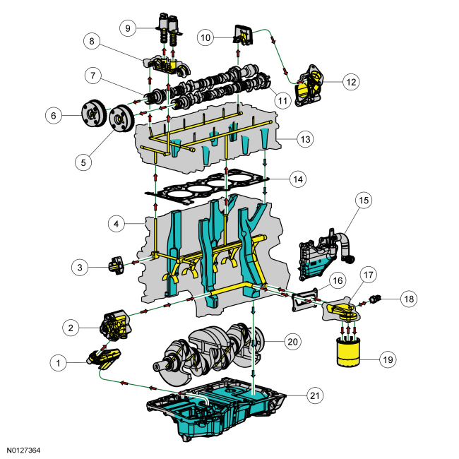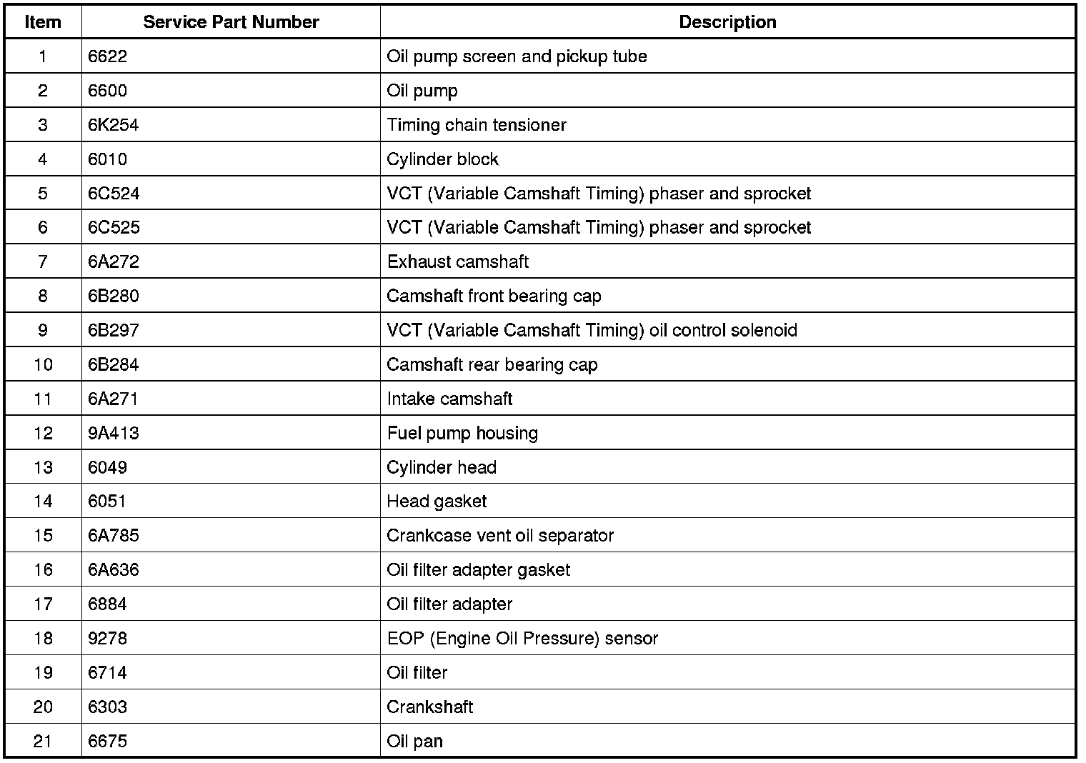 The engine lubrication system is of the force-feed type in which oil is supplied under full pressure to the crankshaft, connecting rod bearings, timing chain tensioners, camshaft bearing caps and VCT (Variable Camshaft Timing) solenoids. The flow of oil to the valve tappets and valve train is controlled by a restricting orifice located in the cylinder head gasket.