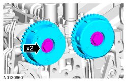 Using the flats on the camshafts to prevent camshaft rotation, tighten the 2 VCT (Variable Camshaft Timing) phaser and sprocket bolts in 2 stages.