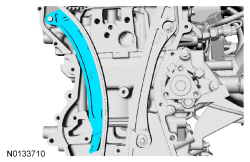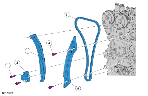 4. NOTE: If the timing chain tensioner plunger and ratchet assembly are not pinned in the compressed position, follow the next 4 steps.