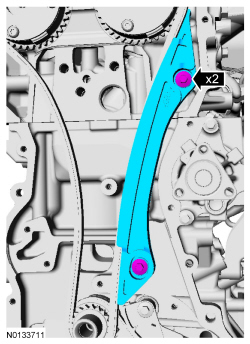 2. Install the LH (Left Hand) timing chain guide and the 2 bolts.