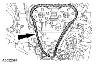 NOTICE: The crankshaft sprocket diamond washer may come off with the crankshaft pulley. The diamond washer must be replaced, remove and discard the diamond washer. If the diamond washer is not installed, engine damage may occur.