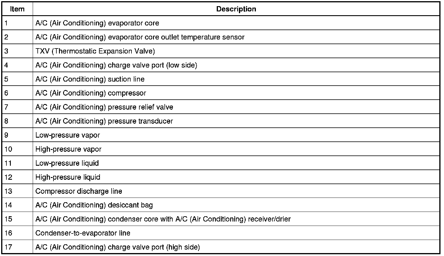During stabilized conditions (A/C (Air Conditioning) system shutdown), the refrigerant pressures are equal throughout the system. When the A/C (Air Conditioning) compressor is in operation, it uses a piston pump to compress the cool vapor, causing it to become high-temperature/high-pressure vapor. The high-temperature/high-pressure vapor is then released into the top of the A/C (Air Conditioning) condenser core.