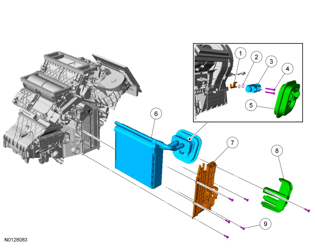 3. Remove the 5 evaporator core cover screws. Remove the heater tube cover, evaporator core cover and remove the evaporator core.