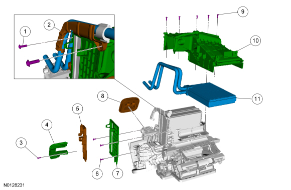 3. Remove the 5 evaporator core cover screws. Remove the heater tube cover and the evaporator core cover.