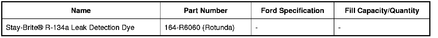 NOTE: Fluorescent refrigerant system dye is added to the refrigerant system at the factory to assist in refrigerant system leak diagnosis using a Rotunda-approved UV (Ultra-violet) blacklight. It is not necessary to add additional dye to the refrigerant system before diagnosing leaks, even if a significant amount of refrigerant has been removed from the system. Replacement suction accumulators and receiver/driers are shipped with a fluorescent dye "wafer" included in the desiccant bag which will dissolve after approximately 30 minutes of continued A/C (Air Conditioning) operation. It is not necessary to add dye after flushing or filtering the refrigerant system because a new suction accumulator or receiver/drier is installed as part of the flushing or filtering procedure. Additional refrigerant system dye should only be added if more than 50% of the refrigerant system lubricant capacity has been lost due to a fitting separation, hose rupture or other damage.