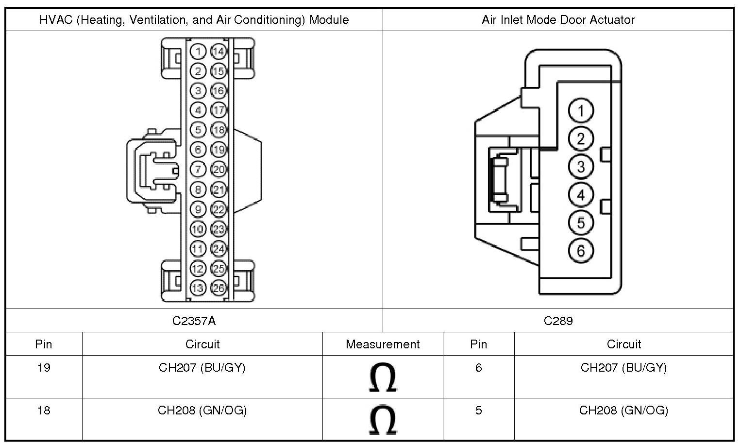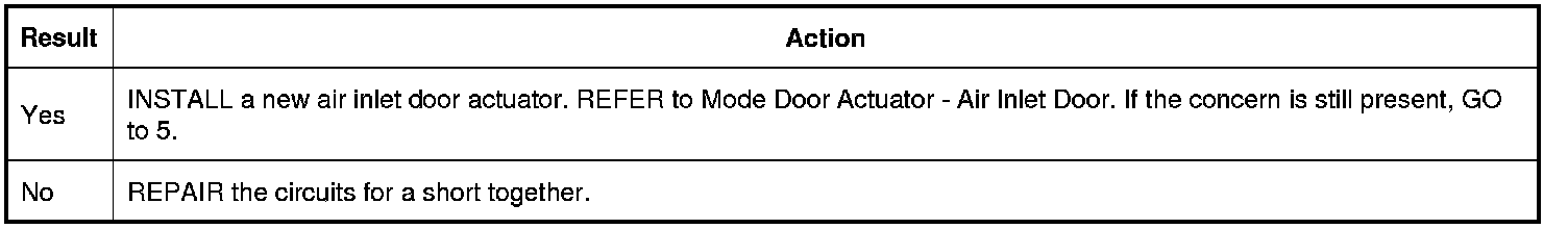 NOTE: Access to the air inlet mode door actuator connector in the is difficult. Before disconnecting the air inlet mode door actuator connector, visually inspect the actuator and harness for obvious damage. If no damage is evident, proceed with the test.