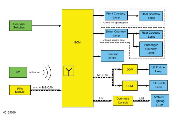 The BCM (Body Control Module) monitors the ignition state and inputs from the RKE (Remote Keyless Entry) system to determine when to energize the interior light relay. When the interior light relay is energized, voltage is provided to the interior lamps. The BCM (Body Control Module) controls the ground side of the courtesy lamps for the illuminated entry and exit features.